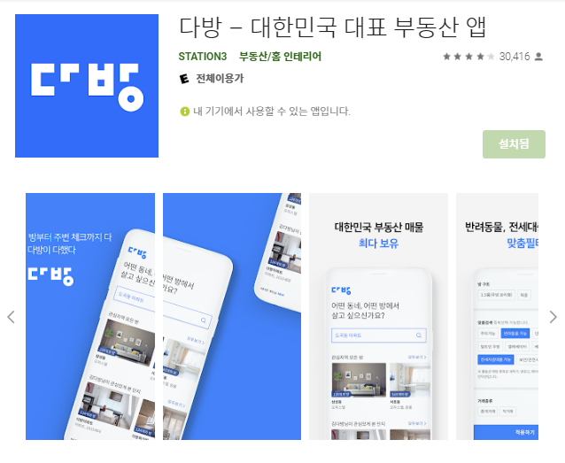 다운로드 수와 이용자 수 모두 타 부동산 어플에 비교해 1위를 달성한 유명한 부동산 서비스 어플리케이션입니다. 허위 매물 건에도 발 벗고 나서 지역별로 매물을 검수하여 허위 매물을 찾아내는 등 근절을 위해 노력하는 모습을 보이고 어플 내의 ‘헛걸음 보상제’와 같이 관련 정책과 규칙을 갱신하면서 시스템의 문제점을 진단하고 피드백을 수용하여 고쳐나가는 자세가 돋보입니다. 부동산 분양 정보를 알 수 있는 기본적인 기능뿐만 아니라 VR을 이용해 매물을 볼 수 있는 재미있는 서비스도 지원되고 실제 살아본 거주민의 리뷰를 읽어보고 실질적인 주거 정보를 알 수 있는 효율적인 어플입니다.