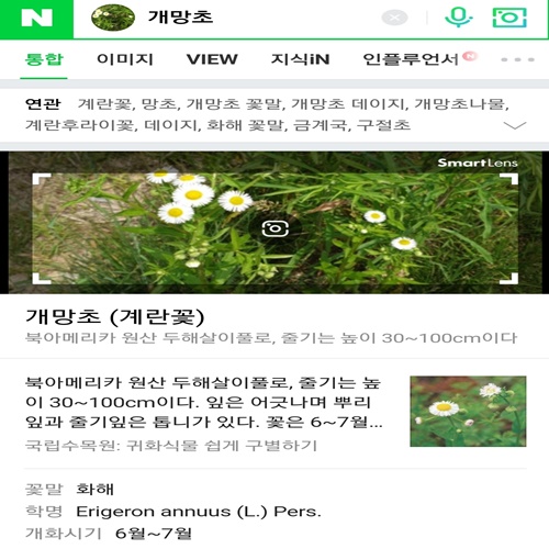네이버 어플리케이션은 사실 쇼핑, 웹툰, 투자, 지도 등 다양한 기능을 지원하고 있어 이미 휴대폰에 다운로드 받아져 있는 분들이 많을 거라 생각됩니다. 네이버 어플을 켜고 가운데 하단의 동그라미 버튼이 바로 스마트 검색 버튼인데요. 이 버튼을 눌렀을 때 카메라 모양의 아이콘의 '렌즈' 옵션이 보이게 되는데 클릭하면 자동으로 카메라와 연결되어 사진을 찍을 수 있습니다. 이름을 알고 싶은 꽃이나 나무, 풀의 사진을 찍는 순간 자동으로 검색이 되고 이름, 학명, 종류, 서식지 등 간단한 정보를 함께 볼 수 있습니다.