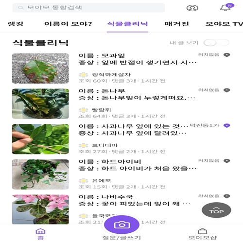 '꽃 이름을 찾아주는 어플' 하면 가장 유명한 어플로, 식물 애호가들이 소통하는 창구로 역할하고 있습니다. 어플의 '이름이 모야' 게시판에서 지식인을 이용하는 것처럼 이름이 궁금한 꽃의 사진을 업로드하면 모야모 유저들과 식물 전문가들이 답변을 달아줍니다. 자동검색 기능이 아닌 사람이 직접 판단하고 답변하는 것이기 때문에 인터넷에서 찾아보는 것보다 비교적 정확한 답변을 받을 수 있다는 장점이 있습니다. 언급했다시피 모야모는 식물 애호가들의 커뮤니티이기 때문에 꽃 이름을 찾는 목적이 아니더라도 키우고 있는 식물의 케어 방법이나 식물도감보다도 다양한 꽃, 풀, 나무들의 정보를 알 수 있습니다. 또한 나무의 묘목이나 식물의 씨앗, 정원 관리 물품 등을 사고 팔 수 있는 시장도 형성되어 있으니 식물에 관심이 많은 분들에게 큰 도움이 될 것 같습니다.