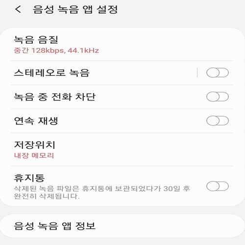 음성녹음어플의 오른쪽 상단의 점 세개를 눌러서 설정이 가능합니다. 업데이트도 가능하고 녹음 음질 설정이 가능합니다. 저음질로 설정하면 64kbps, 44.1kHz, 중간 음질은 128kbps, 44.1kHz, 고음질은 256kbps, 48kHz로 녹음됩니다. 녹음된 목록을 연속 재생으로 할 수 있는 기능 설정도 할 수 있습니다. 스테레오로 녹음, 녹음 중 전화 차단, 저장 위치, 휴지통의 영구삭제 기간 설정 등이 가능합니다.